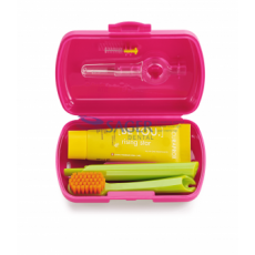 Szájhigiénia útközben is! Egyedülállóan kompakt szett szétszedhető utazó fogkefével, 10 ml-es mini fehérítő fogkrémmel és két fogköztisztító kefével praktikus dobozban - tökéletes szájhigiénia bárhol is van.