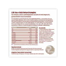 Az LXR VAS+FOLÁT RETARD KOMPLEX vashiányos állapotokban a vas pótlására fejlesztett jól hasznosuló szerves vasvegyületet (vas-fumarát) tartalmazó összetett hatású készítmény. A hatóanyagkombináció a vas szervezeten belüli transzportját és hasznosulását, valamint az egészséges vérképződést támogató vitaminokat és ásványi anyagokat is tartalmaz. A módosított hatóanyagleadású formulából a kapszulánkénti magas vastartalom (30 mg) kioldódása nem pillanatszerű, hanem 3-4 óra alatt egyenletesen szabadul fel. Ez a technológiai eljárás kíméli a gyomrot, mivel védi a gyomornyálkahártyát a vasvegyület hirtelen kialakuló magas koncentrációjával és az általa okozott erózióval szemben. A hatóanyag időben elhúzódó felszabadulása a székrekedés kockázatát is csökkentheti.