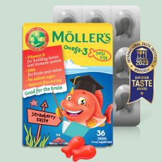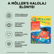 A Möller’s omega-3 gumivitaminban található DHA hozzájárul az agy és a szem normál működéséhez. A kedvező hatás eléréséhez napi min. 250 mg DHA szükséges. A D-vitamin szükséges a gyerekek számára a megfelelő növekedéshez és csontfejlődéshez és hozzájárul az immunrendszer rendes működéséhez.