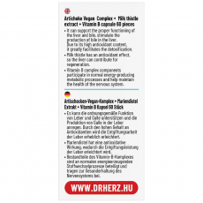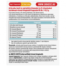 Figyelmeztetés: A termék fogyasztása nem helyettesíti a kiegyensúlyozott vegyes étrendet és az egészséges életmódot! Összetevők: articsóka levél kivonat (cynara scolimus l.), máriatövis termés kivonat (silybum marianum), niacinamid (B3-vitamin), kalcium-d-pantotenát (B5-vitamin), riboflavin (B2-vitamin), piridoxin-hidroklorid (B6-vitamin), tiamin-hidroklorid (B1-vitamin), tömegnövelő szer (kukoricakeményítő), csomósodást gátló anyag (mikrokristályos cellulóz), kapszulahéj (hidroxipropil-metilcellulóz)