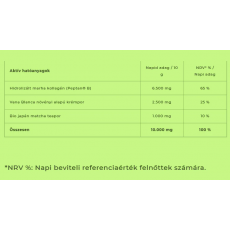 Összetevők: Hidrolizált marha kollagén (Peptan® B), Vana Blanca növényi alapú krémpor, Bio japán matcha tea por. Nettó súly: 100 g, 10 napi adag Figyelmeztetések: Kisgyermekek elől elzárva tartandó! A termék nem helyettesíti a vegyes étrendet és az egészséges életmódot! Ne lépd túl az ajánlott napi fogyasztási mennyiséget! Minőségét megőrzi: A termék szagtalan helyen, 6 és 26°C közötti hőmérsékleten, valamint 65%-os relatív páratartalom alatt tárolva minőségét 2 évig megőrzi. Tárolás: A terméket szagtalan helyen, 6 és 26 °C közötti hőmérsékleten, valamint 65%-os relatív páratartalom alatt tárold!