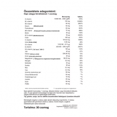 Minden doboz tartalmaz 30 kényelmesen hordozható csomagot, ami minden létfontosságú vitamint és ásványi anyagot tartalmaz a lehető legtermészetesebb formában. Minden napi multivitamin csomag tartalmazza az alábbi 5 féle készítményt: